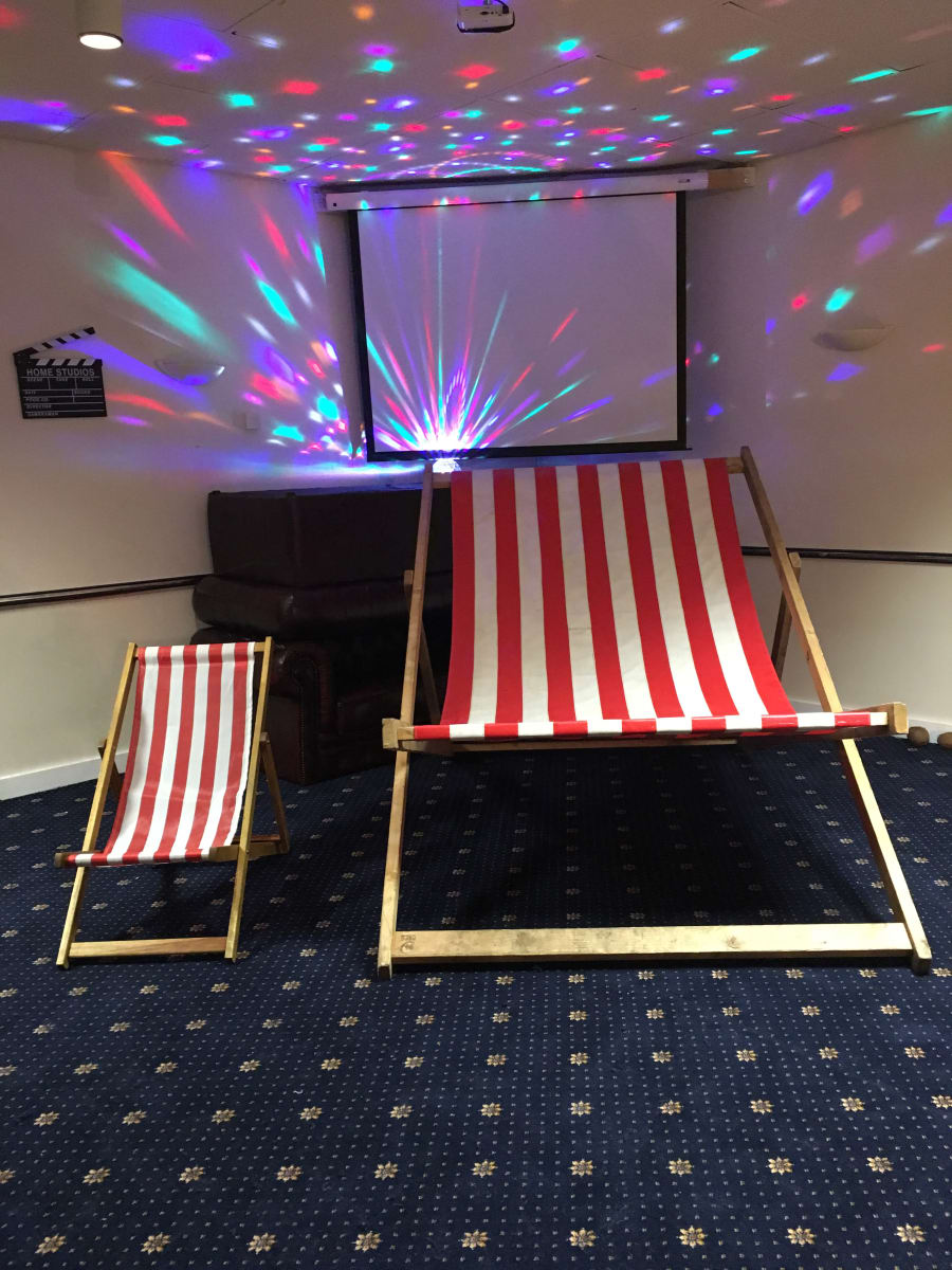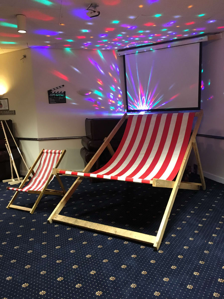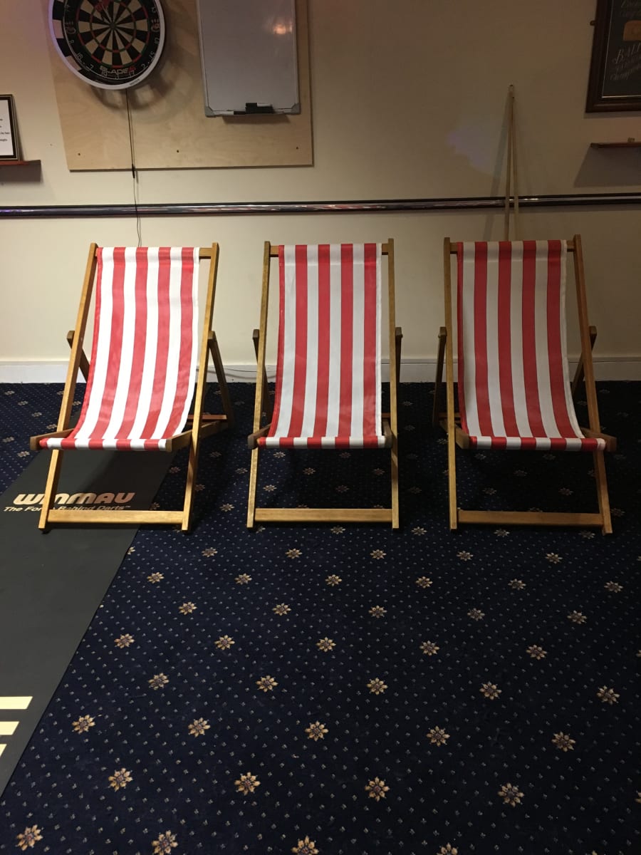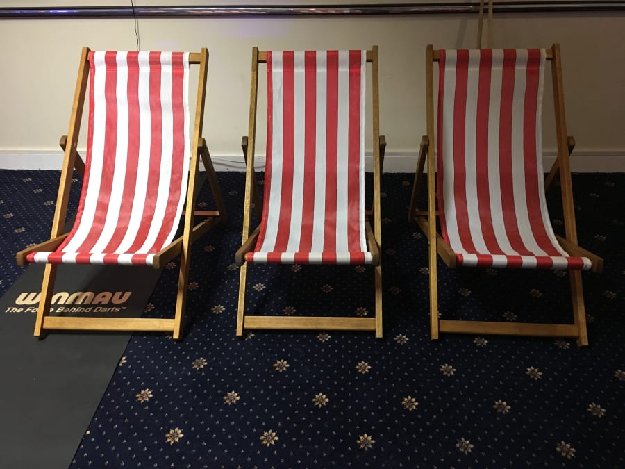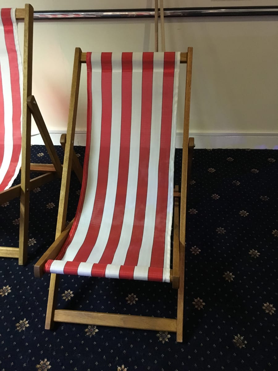 A Traditional Beach Style, Red and White Striped Deck Chair. We have up to 100 available! These are the very same deck chairs that you see traditionally on beaches, up and down the UK. A niche idea for wedding guest seating, or as a fun prop for a themed event... They are equally great for outside cinema, music events, country shows, fates & much much more!